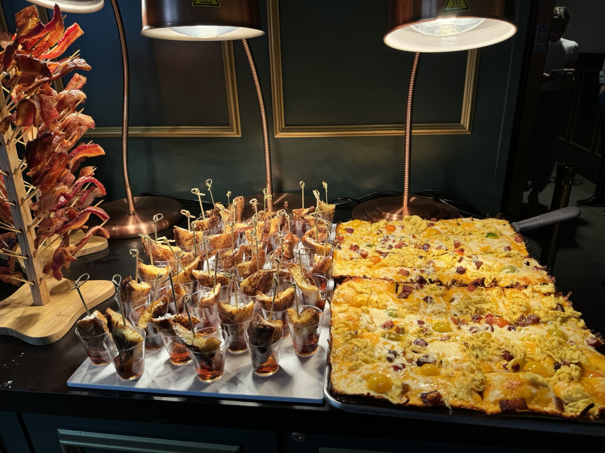 The Main Bar: To your right, a long, full-service bar is the centerpiece of the space. It features 12 rotating beer taps, shelving filled with a wide selection of spirits, and four TVs mounted above the taps. Just beyond the bar is a modern concrete wall with four more TVs, perfect for showing presentations, branding, or the night’s games.